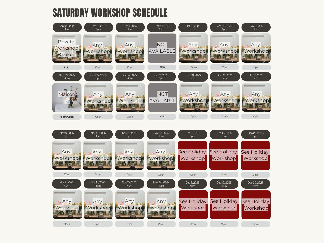 At W Floral, we provide Saturday workshop classes featuring various floral arrangements every week. We have 1 pm and 4 pm slots available for our hobby workshops on Saturdays. Once a participant registers for a specific workshop on a designated day and time, that slot becomes reserved for that workshop. We will gladly welcome additional participants until we reach a maximum of 6 participants, at which point the workshop will be closed. In the event that only one participant is registered for a workshop, we will regrettably have to cancel the workshop, providing a 48-hour notice. We apologize for any inconvenience this may cause, but this decision is due to the substantial cost and labor invested in each workshop; a minimum of 2 participants is required to proceed. If you're interested in booking a private workshop, we ask for a minimum of 4 participants. The more, the merrier! If you have 4 participants already registered and wish to keep it a private workshop, please indicate your preference during the registration process on our website. For details on booking, please refer to our hobby workshop schedule below